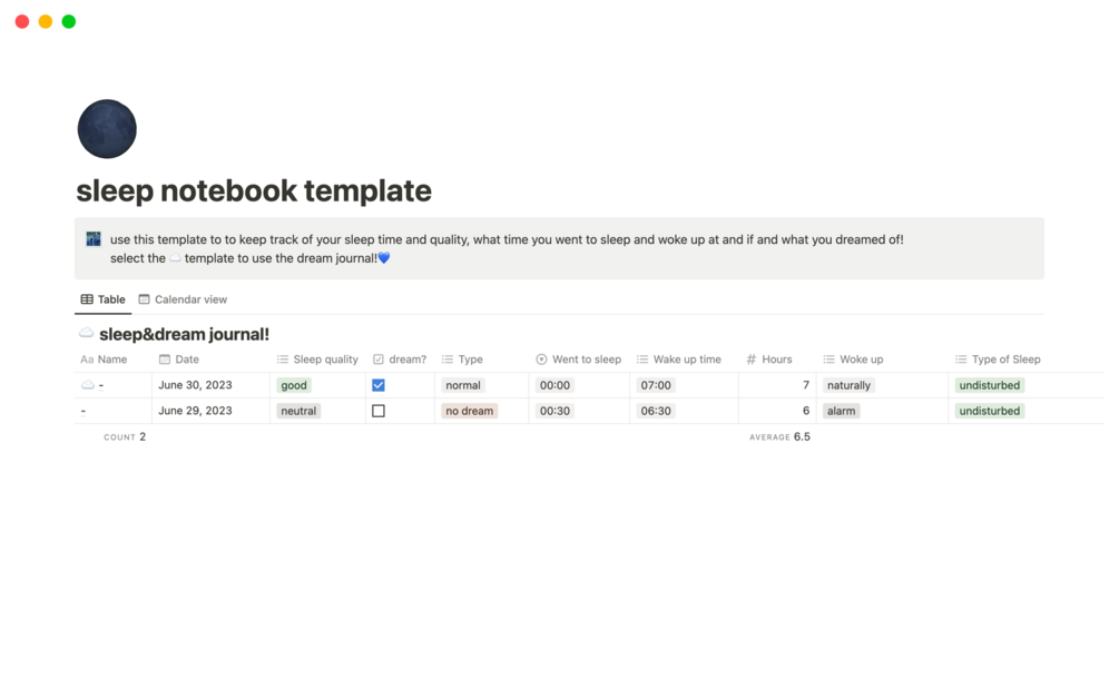 this template not only lets you track your sleep quality (hours slept, what time you went to sleep and when you woke up, how did you sleep, how you woke up etc.) but also has an in-built page template that helps you write down the dreams you had during the night, what they might mean and how did they make you feel.